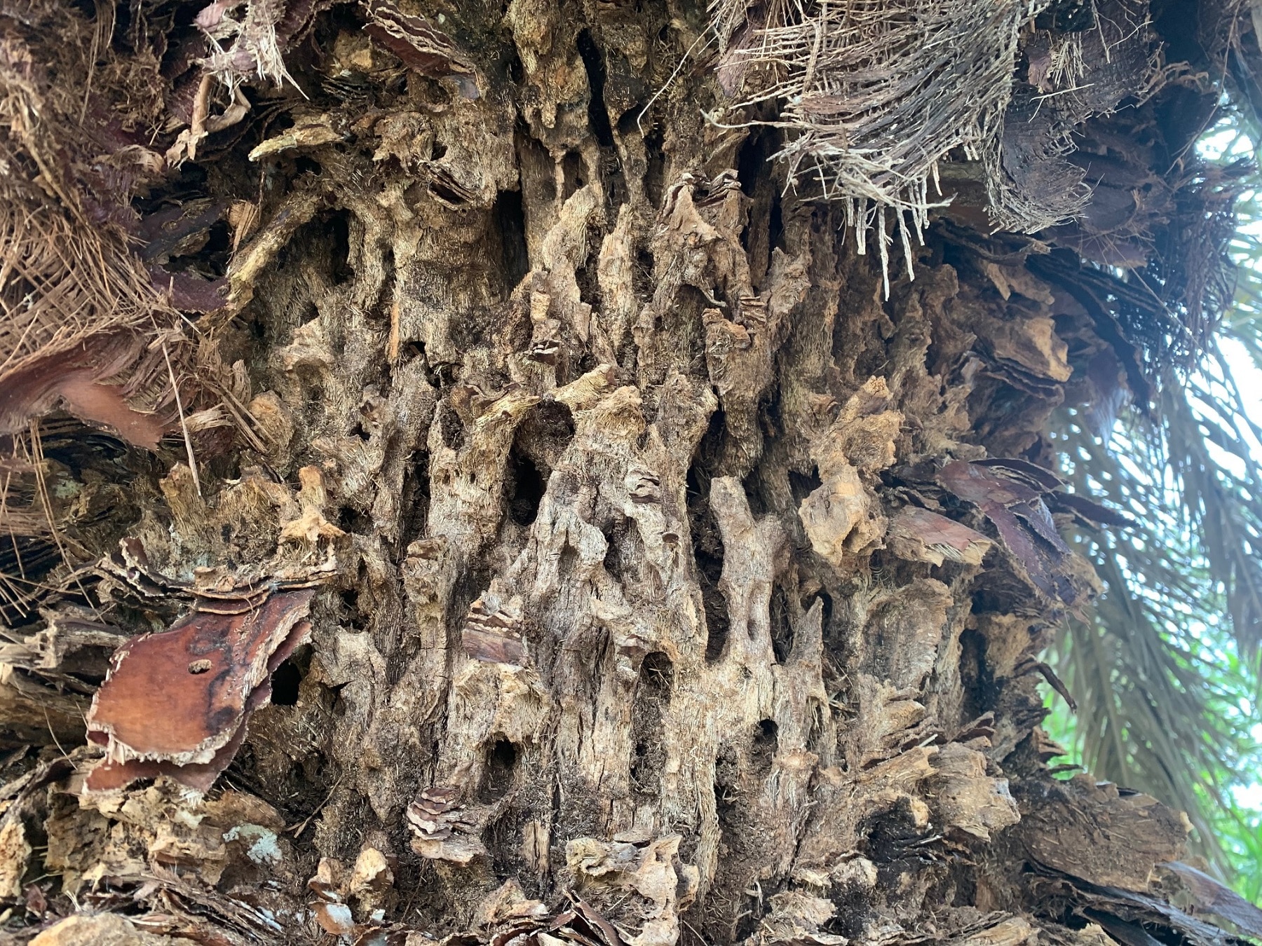 - Des galeries ont été creusées tout le long du pétiole (centre de la feuille) et dans le tronc,